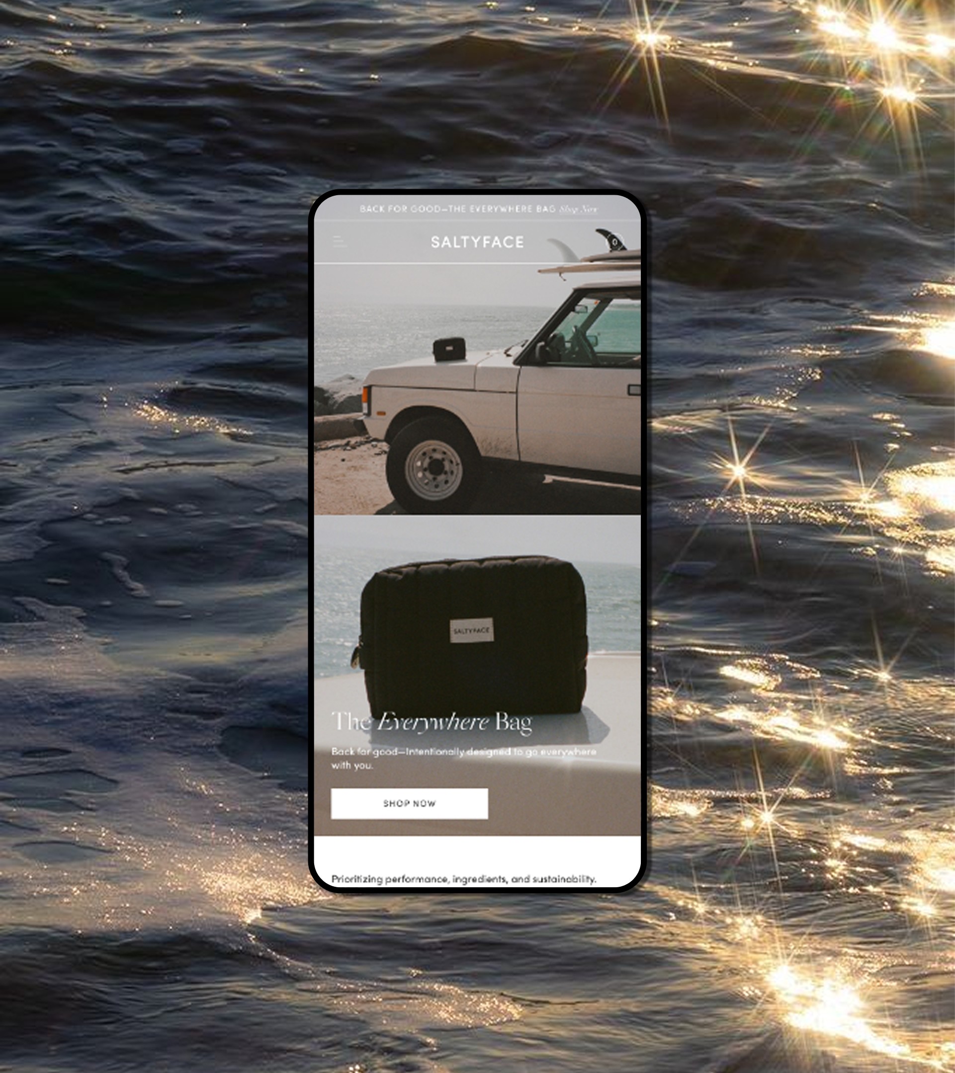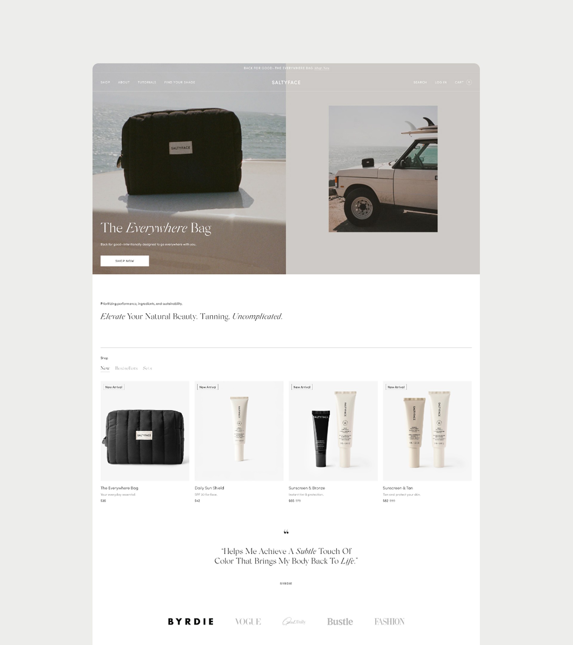 Natural tanning brand Saltyface approached needing a strong E-Commerce website to support their boom in sales from viral social media ads. Being a DTC-only brand, there was a strong focus on both UI/UX performance and aesthetic curation to build an experience that was both immersive into the Saltyface brand world (glowy, sunny, effervescent) and intuitive for customers to navigate. From wireframes, UI kit creation, sitemapping exercises, quiz logic ideating, and multiple rounds of design, we launched the website which has served the brand through multiple launches and seasons over the last few years. Lead Designer: Emily Hall. Director: Jhoanna Flores. Company: Willa Creative.