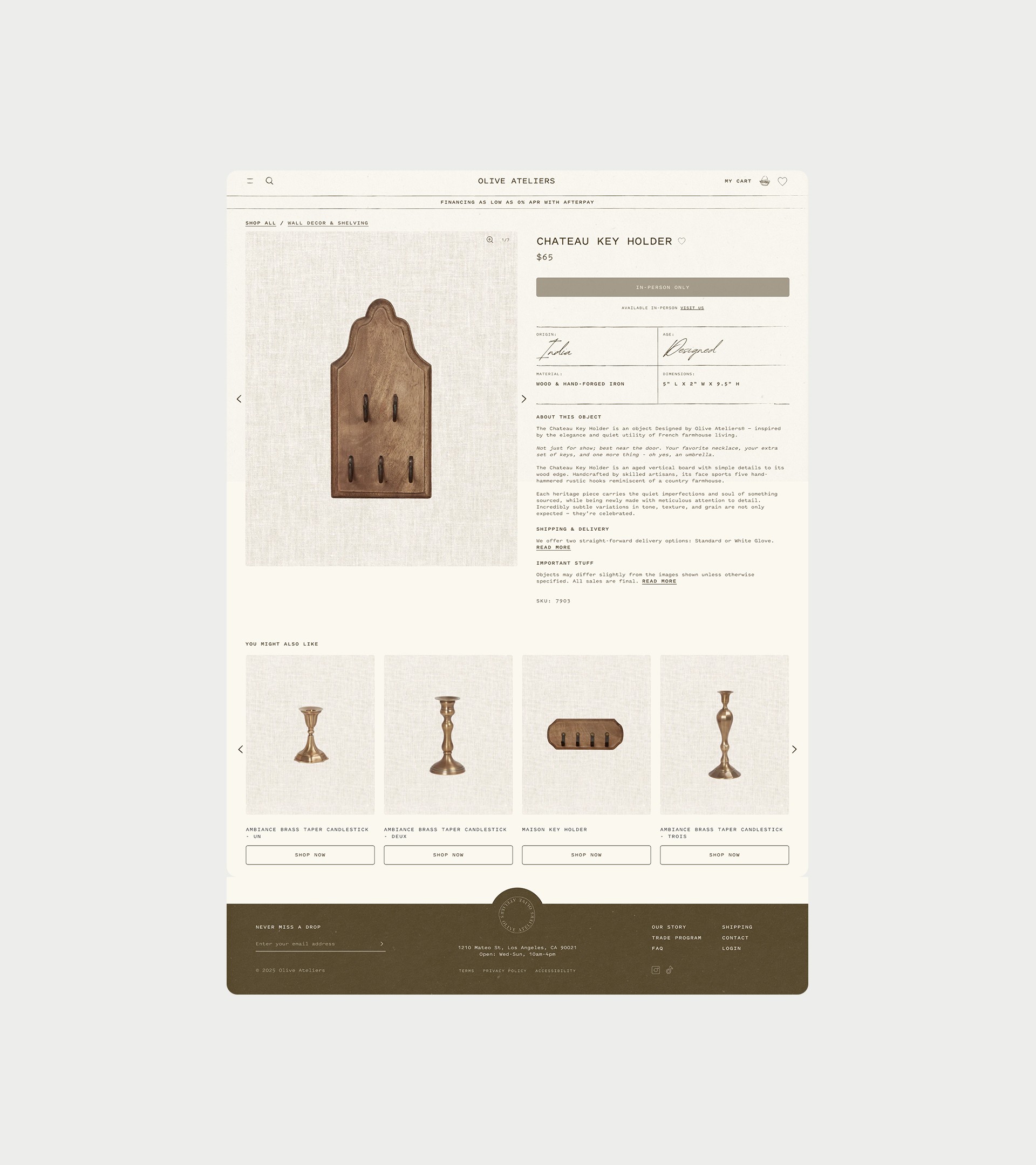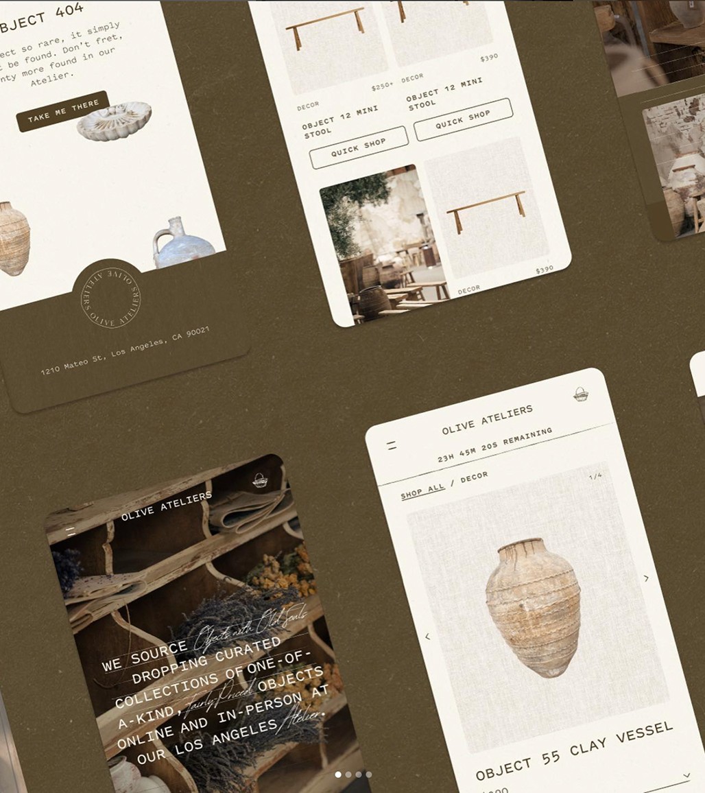 Olive Ateliers tasked us with creating an online store that would rival their in-person shopping experience, immersing the user in a digital space filled with old world charm. Small elements of surprise & delight through animations and microinteractions were layered in to reward discovery. The design also involved solving unique challenges such as creating intuitive front-end UI and simplified back-end CMS in Shopify to support the drop model. The drop model would excite customers by building hype through a sitewide countdown and sale previews, while also making drop days seamless the moment it hit. Lead Designer: Emily Hall. Director: Jhoanna Flores. Company: Willa Creative.