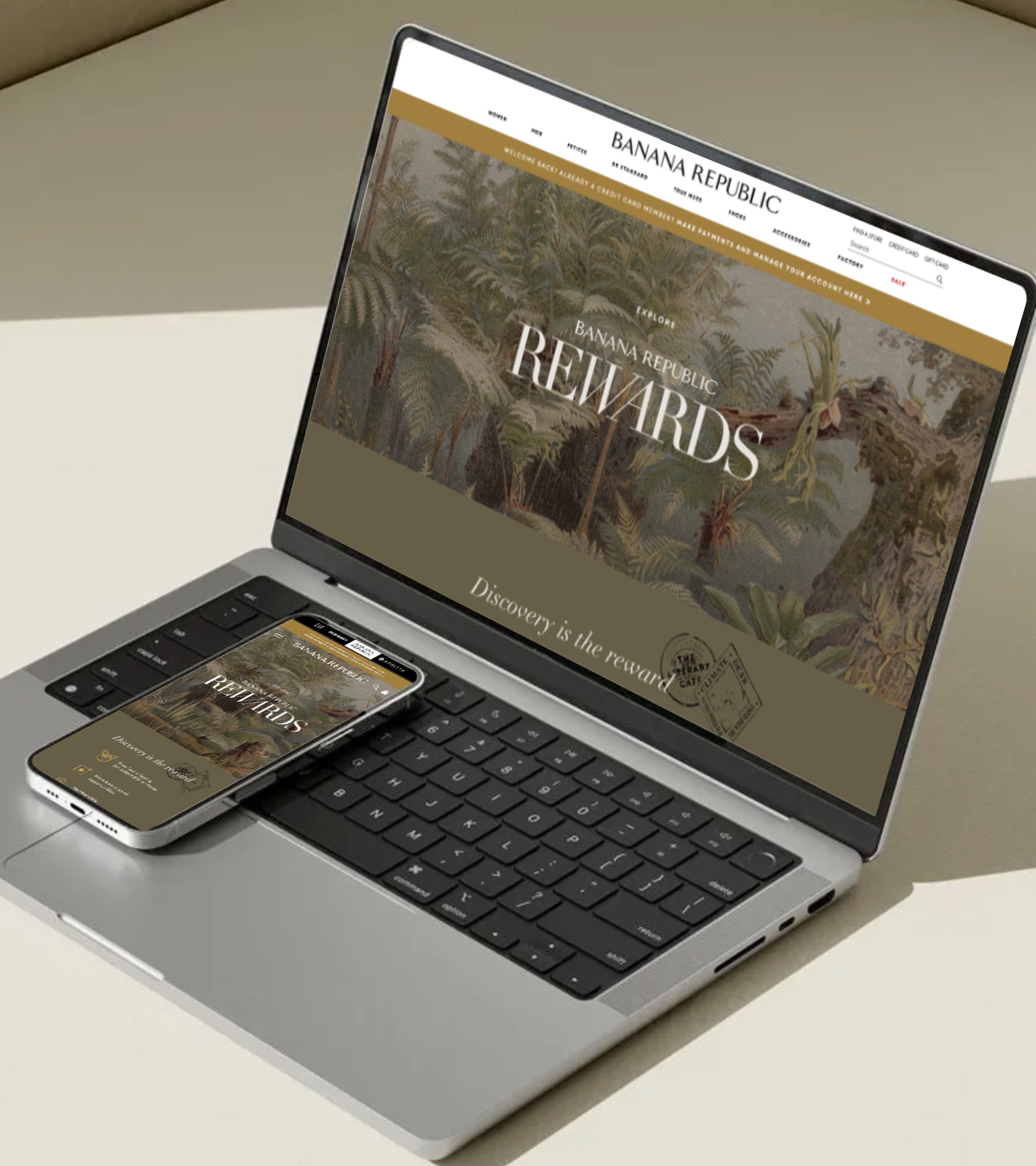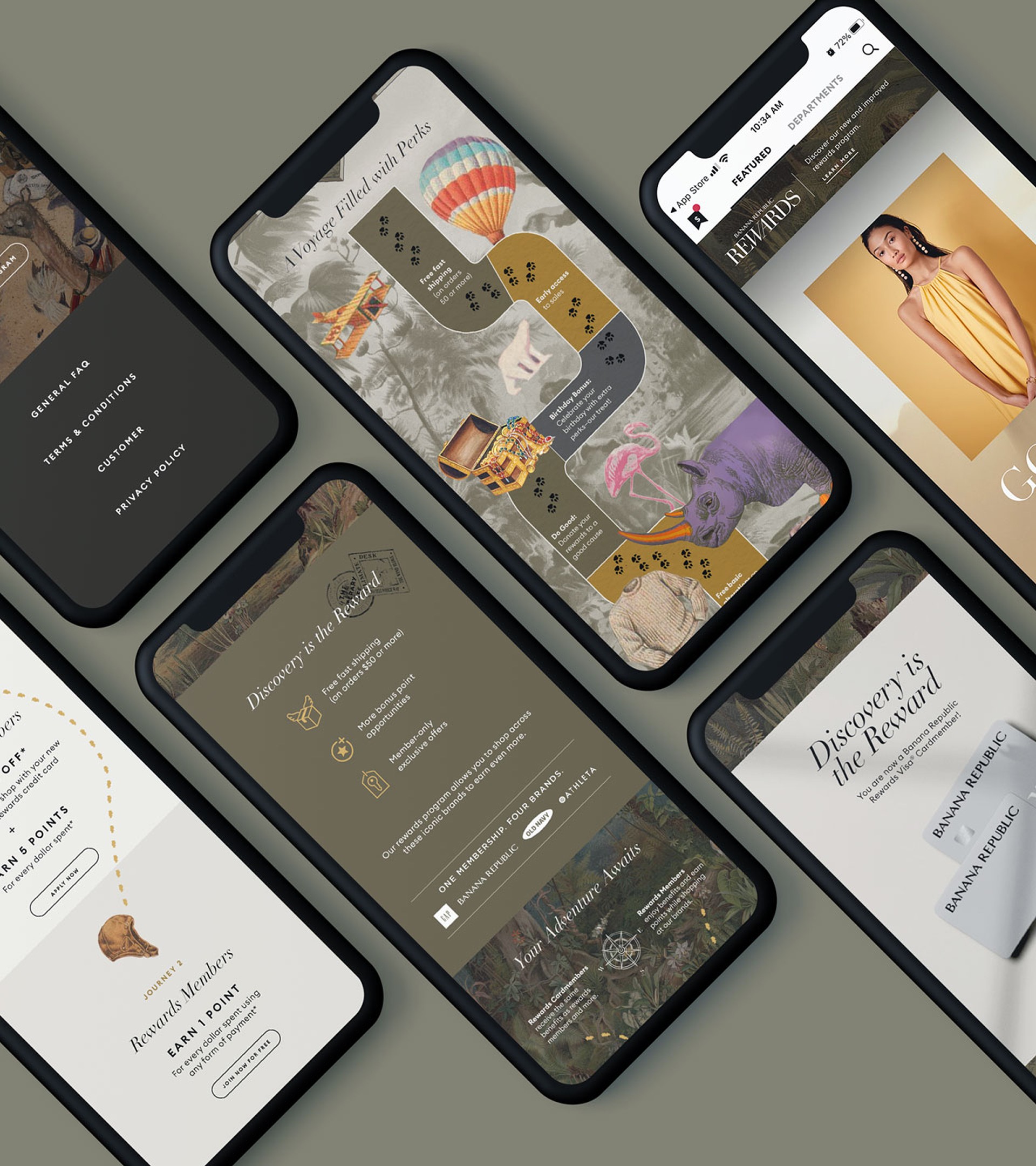 With the launch of the BR Rewards program, a system was needed that would pave the way for a unique identity to develop among Banana Republic’s overarching branding. The project included a brand identity system & guidelines, the creation of infrastructure through templates, and design for print collateral, in-store signage, the BR Rewards landing page, app home page, email templates, site widgets, and 50+ unique email templates and digital ads. We dug deep into the archives to unearth catalogue relics, creating a layered and collaged visual approach that become part of BR Rewards identity, most prominently on the landing page. A gamified experience on the lander pushed boundaries for Banana Republic’s brand at the time. Lead Designer: Emily Hall. Creative Director: Ricky Kim. Company: Banana Republic.